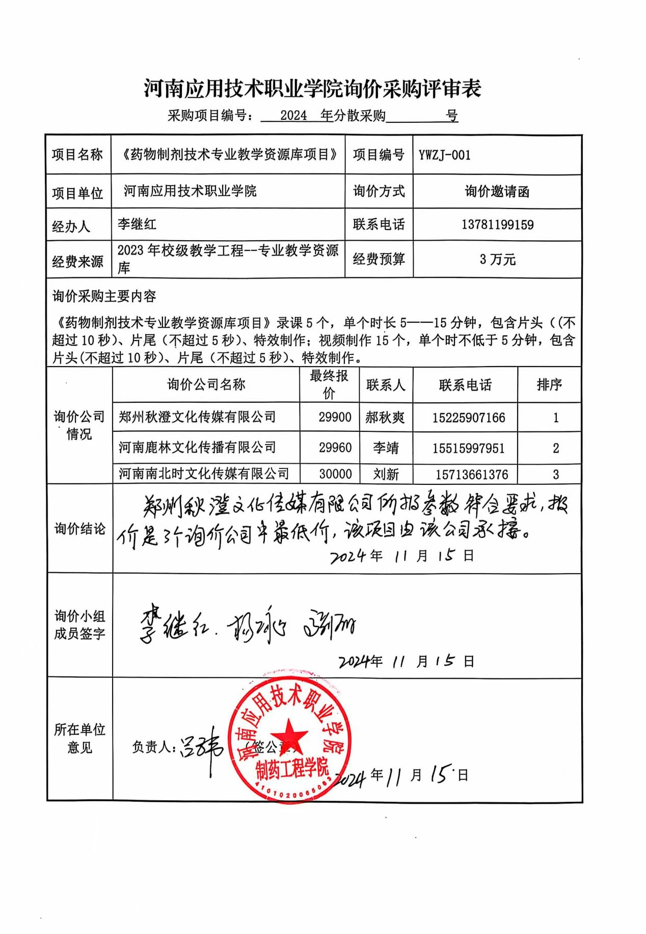 制药工程学院“药物制剂技术专业教学资源库项目” 询价采购项目评审公示