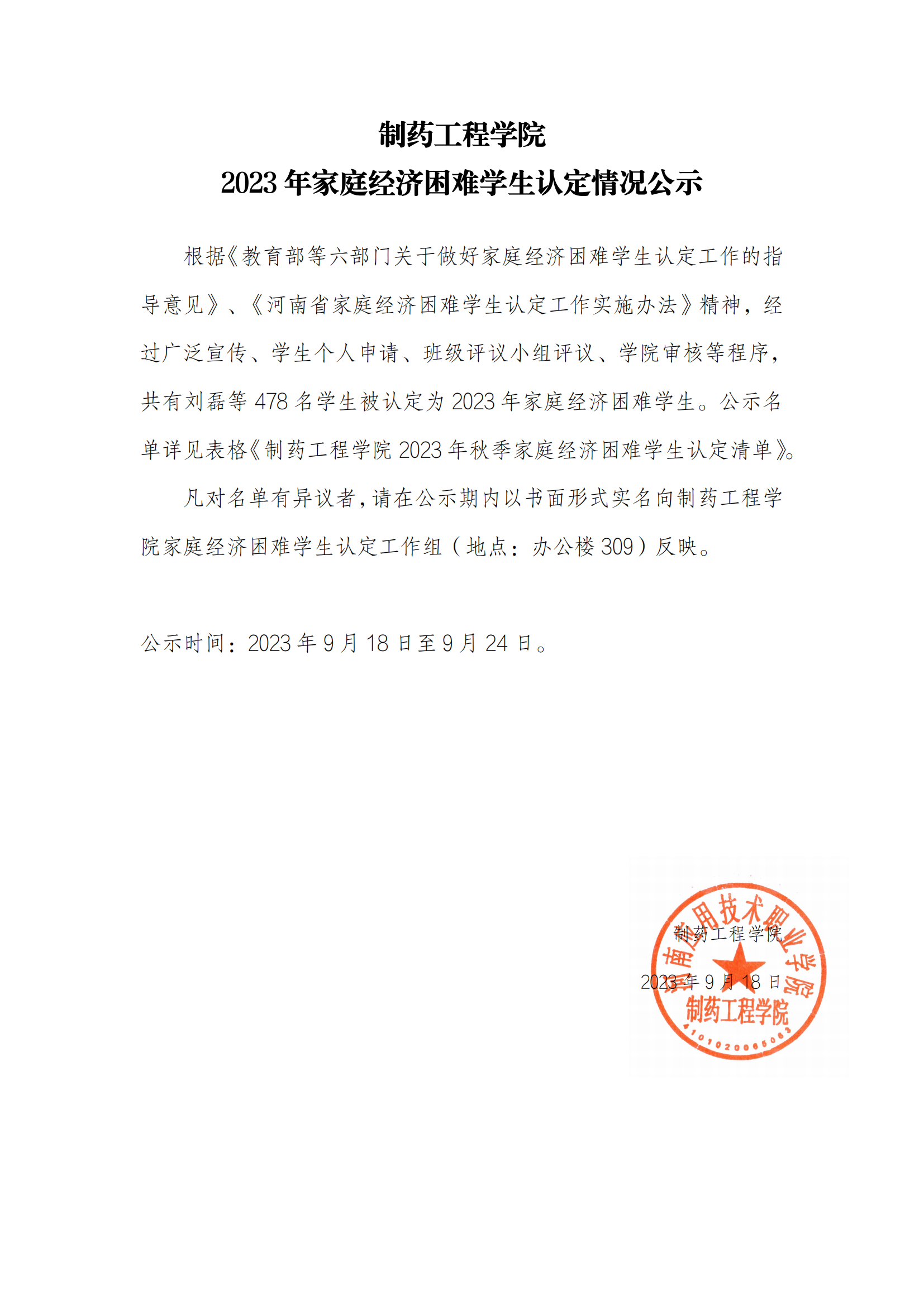 制药工程学院 2023 年家庭经济困难学生认定情况公示