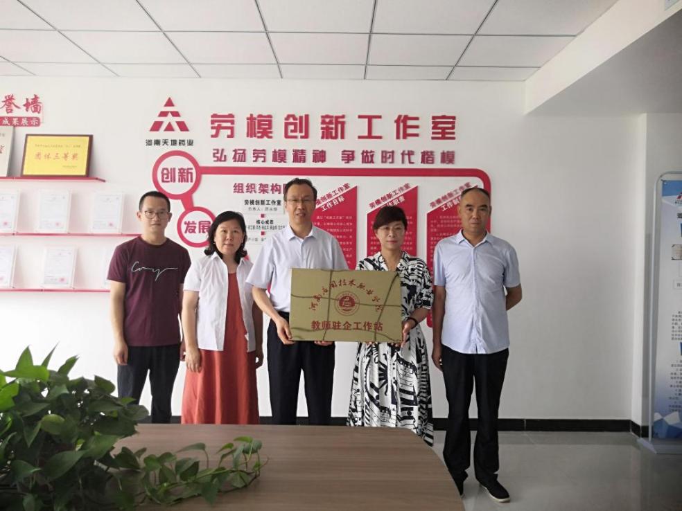 制药工程学院教师驻企工作站签约揭牌仪式于2021年6月22日在河南天地药业股份有限公司顺利举行。制药工程学院院长韩恩远与河南天地药业党委书记、副董事长贾云共同为教师驻企工作站揭牌。制药工程学院党总支书记窦传斌和部分教师以及天地药业部分领导参加了揭牌仪式。