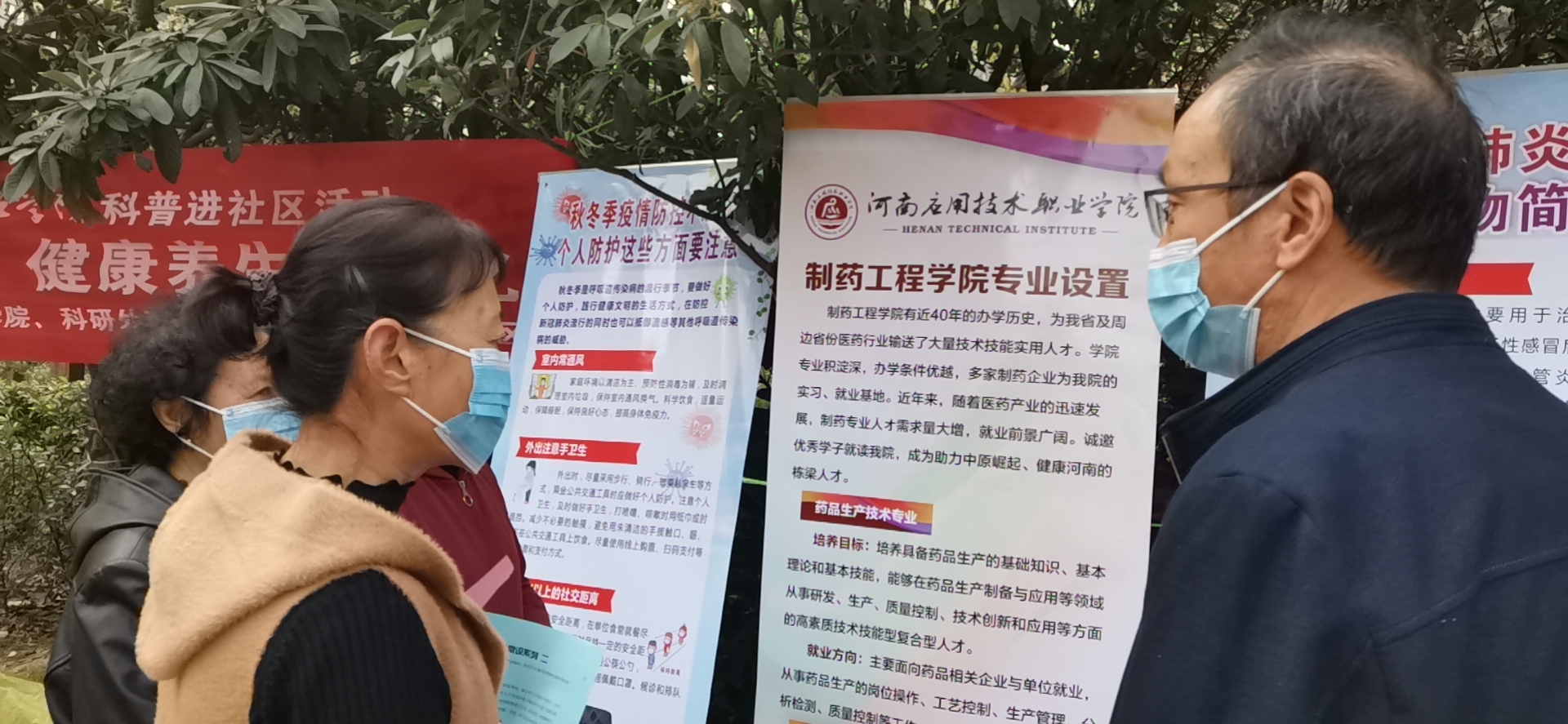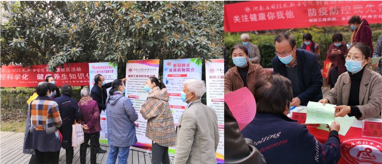 根据《教育部等十部门关于做好 2020 年职业教育活动周相关工作的通知》,文件指出要开展技术技能服务活动,要求:“各地、各职业院校和行业企业要根据当地疫情防控要求,设置开放场地,利用专业技术技能为社区居民、市民群众提供防疫知识宣传、健康护理、生活服务、家电维修保养、传统工艺、职业礼仪、环境保护、进城务工常识普及等服务。”,必赢国际437官网积极响应教育厅和学校的号召,制药工程学院联合科研外事处、金耀办事处开展了防疫防控知识及药品常识科普宣传活动。