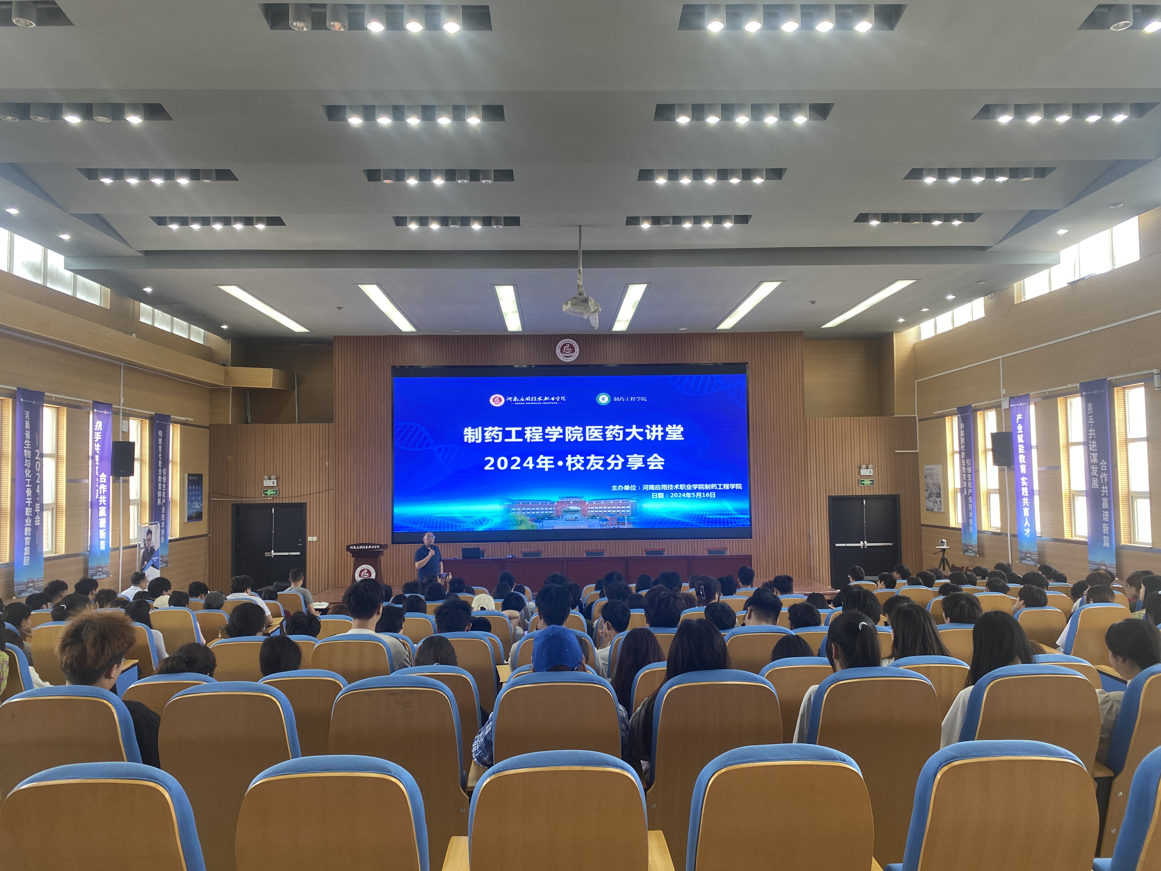 2024年5月16日,制药工程学院在开封校区南院学生活动中心召开2024年职教活动周系列活动之“药”你同行促成长校友分享会。副校长常新中、校企合作与就业处处长马春燕、优秀校友河南省越人集团总裁助理王二奎、学院全体教职工、学院200余名学生参加会议,会议由制药工程学院院长吕玮主持。