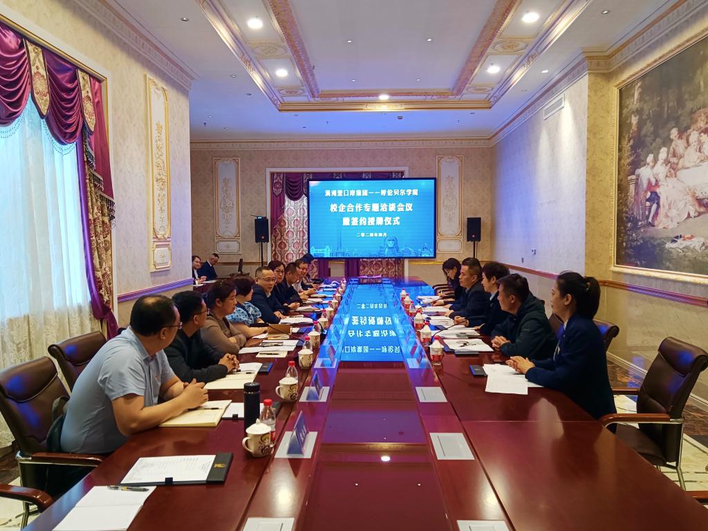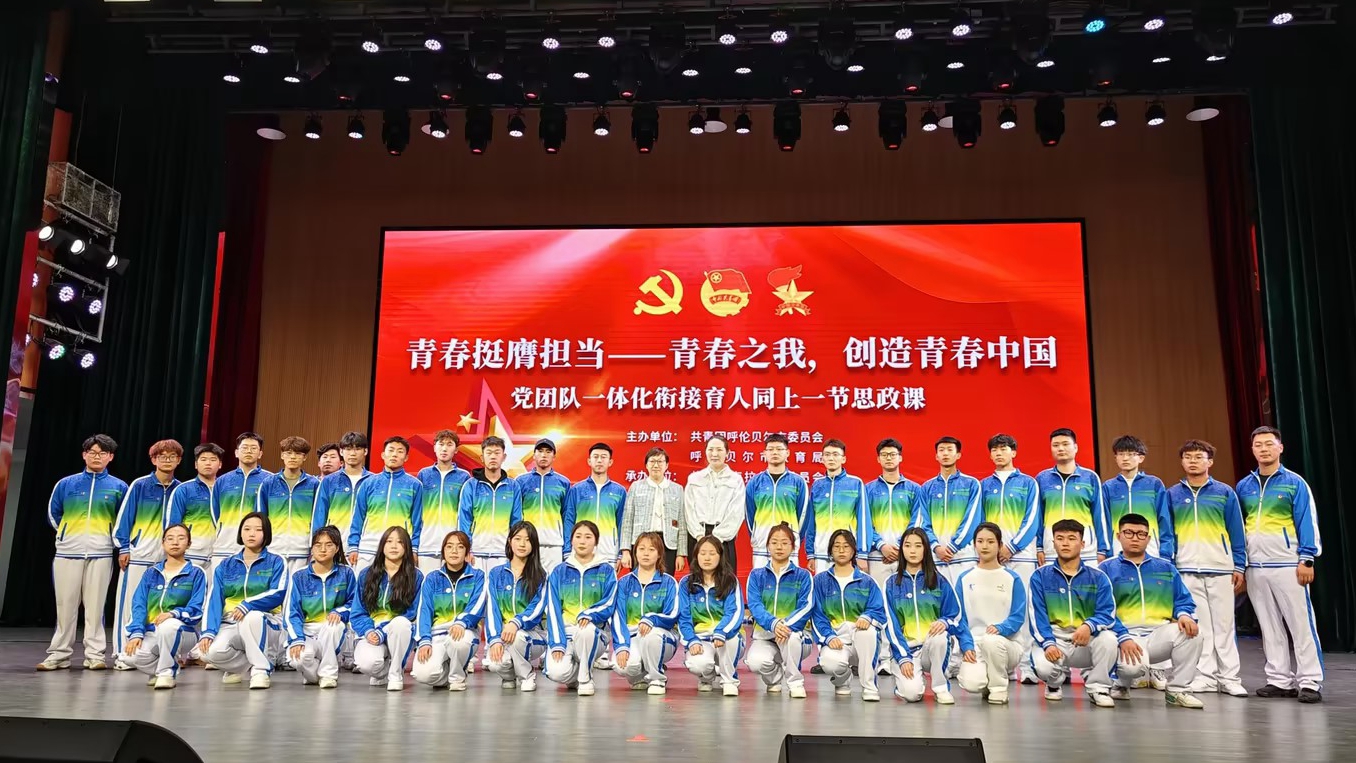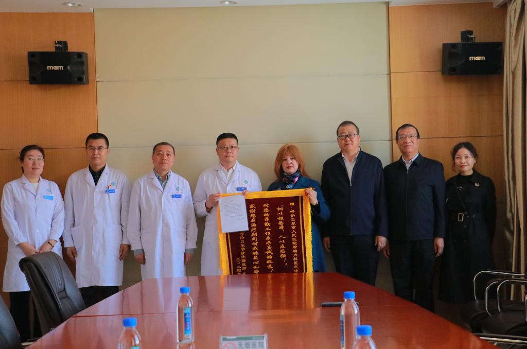 校党委副书记张宏天陪同外籍教师尤利娅向呼伦贝尔市人民医院赠送锦旗