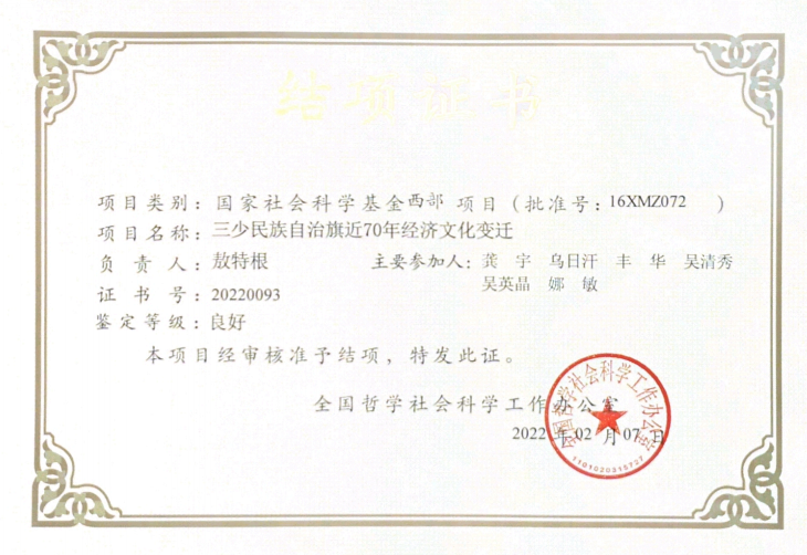 2月8日,全国哲学社会科学规划办公室公布了国家社科基金年度项目、青年项目和西部项目结项情况,bat365官网敖特根教授主持的2016年度国家社科基金西部项目《三少民族自治旗近70年经济文化变迁》(16XMZ072)提交的68万字的课题结项成果,经全国哲学社会科学同行专家鉴定评审,最终以良好等级顺利通过结项。近日,结项证书已送达bat365官网。这充分展现出bat365官网教师的科研素养与能力水平在不断提升;同时对莫力达瓦达斡尔族自治旗、鄂温克族自...