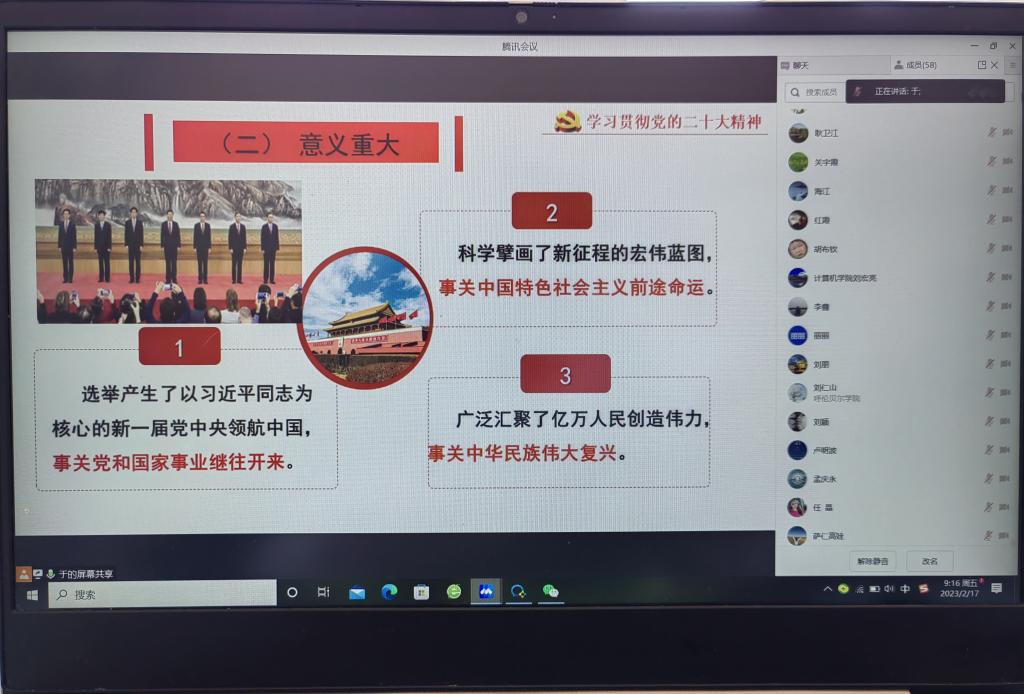 为持续掀起学习宣传贯彻党的二十大精神热潮,引领干部职工把思想和行动统一到党的二十大精神上来,2月17日上午,bat365官网邀请呼伦贝尔市党的二十大专题宣讲团成员、呼伦贝尔市委党校党建教研室于莉教授作专题宣讲。宣讲报告会以线上方式进行,部分二级学院领导班子成员、科级干部、党支部书记参加会议。会上,于莉教授以《新时代新征程的政治宣言和行动纲领——学习党的二十大精神》为题,从党的二十大举世瞩目意义深远、党的二十...